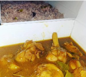 The curry is traditionally served with rice or roti, which helps soak up the flavourful sauce. It may also be paired with side dishes like fried plantains or coleslaw for added texture and balance.