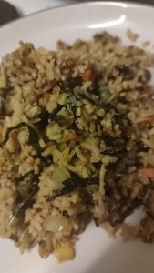 - Add the cold, cooked rice to the pan, breaking up any clumps with a spoon or spatula. Stir everything together so the rice is coated with the oil and evenly mixed with the vegetables and eggs.
