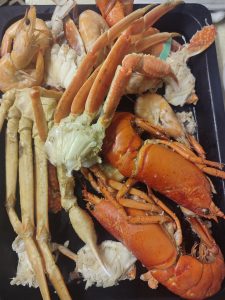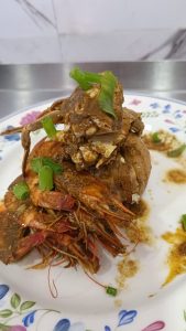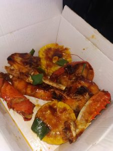 is typically a delightful and indulgent seafood dish that combines the flavours of prawns and crab, often served together in a box or container, making it a convenient and fun way to enjoy these delicacies. Here’s a description of what you might expect from such a dish: